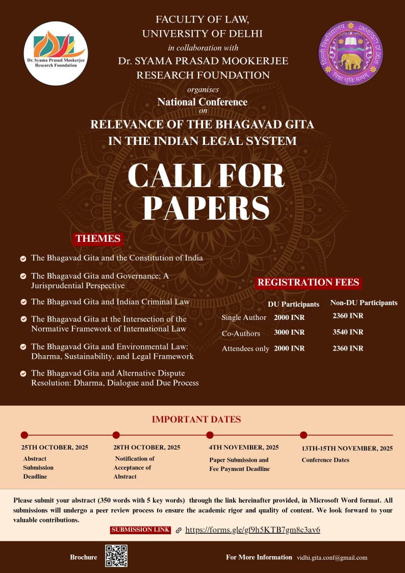 The Faculty of Law, University of Delhi, in collaboration with the Dr. Syama Prasad Mookerjee Research Foundation (SPMRF), is proud to host a 3 day National Conference on the Relevance of Bhagavad Gita in Indian Legal System. The Conference will take place in offline mode at the Faculty of Law, University of Delhi. This unique academic initiative seeks to explore the ancient wisdom of the Bhagavad Gita and its continuing influence on legal thought, ethical governance, and the practice of law in India.